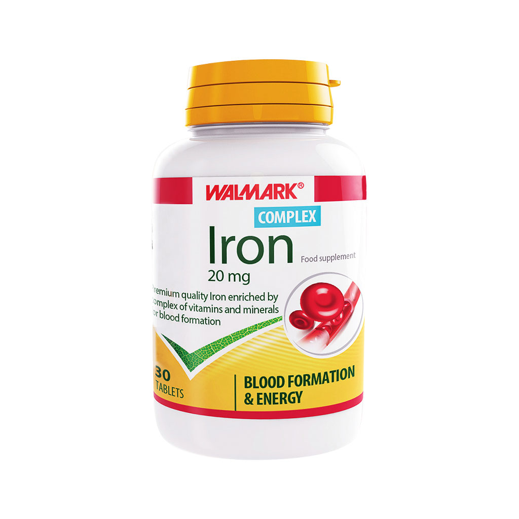 یکی از عناصر حیاتی بدن آهن است که بدن باید روزانه حداقل نیاز خود از این عنصر را از طریق تغذیه و یا مصرف مکمل های غذایی دریافت کند. در غیر اینصورت فرد مبتلا به بیماری کم خونی ناشی از فقر آهن می شود. علایم این نوع کم خونی شامل سردرد، سرگیجه، تپش قلب، تنگی نفس، خستگی، خشکی و شکنندگی ناخن و مو، رنگ پریدگی، ضیف شدن عضلات و بیقراری است. قرص آیرون کمپلکس والمارک مکمل غذایی مناسب پیشگیری و درمان کمخونی است که هر قرص آن حاوی 20 میلیگرم آهن است و شما با مصرف روزانه یک قرص این مقدار آهن را برای بدن فراهم میکنید. همچنین این محصول به غیر از آهن حاوی ترکیبی از آهن، ویتامین C، ویتامین B6، B12 و اسید فولیک (B9) است. آیرون کمپلکس، کیفیت ممتاز غنی شده با مجموعه ای از ویتامین ها و مینرال هاست که برای تشکیل خون لازم هستند. آهن جزء ضروری هموگلوبین در گلبول های قرمز است که همراه با ویتامین B12 برای تشکیل طبیعی گلبول های قرمز حیاتی است. ترکیبات موجود در این مکمل به طور اخص برای اهدا کنندگان خون بسیار مناسب است زیرا سبب بازیابی سریع خون پس از اهدا میشود.