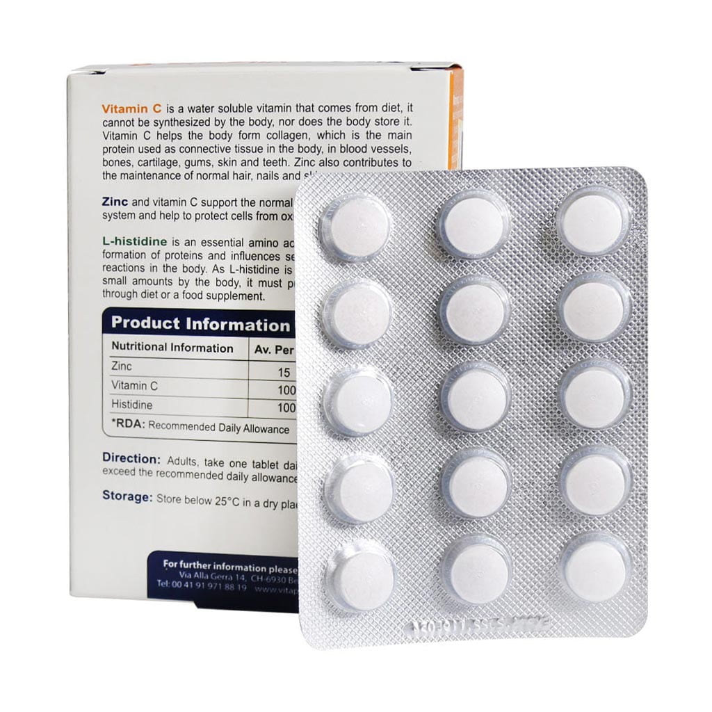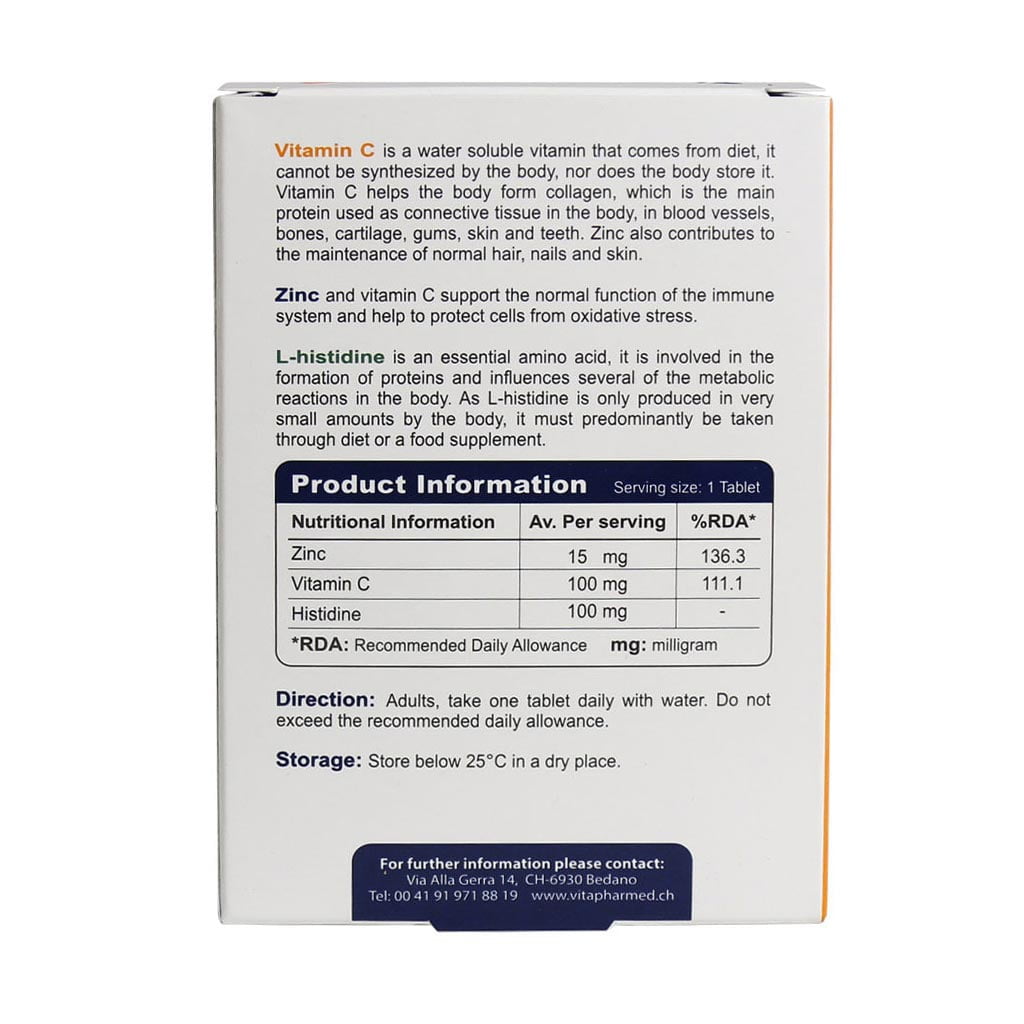 قرص زینک پلاس ویتامین C هیستیدین ویواتیون دارای ترکیبات منحصر به فردی است که سبب تقویت سیستم ایمنی بدن میشود. ویتامین ث موجود در این قرص، یک ویتامین محلول در آب است که بدن قادر به سنتز آن نیست و از رژیم غذایی به دست میآید. ویتامین سی به شکل گیری کلاژن که پروتئین اصلی به کار رفته در بافت همبند، استخوان، غضروف، لثه، عروق خون، دندان و پوست است کمک میکند. زینک سبب سلامت پوست، ناخن و مو میشود و همراه با ویتامین c در حفاظت از بدن در برابر استرسهای اکسیداتیو کمک میکند.
