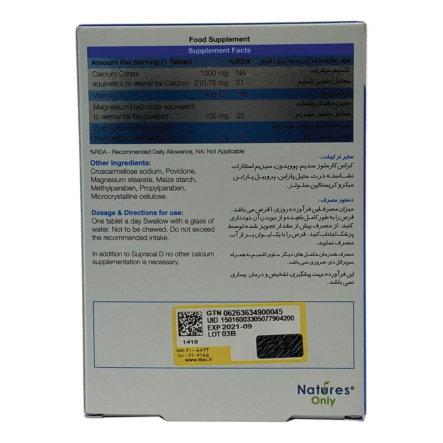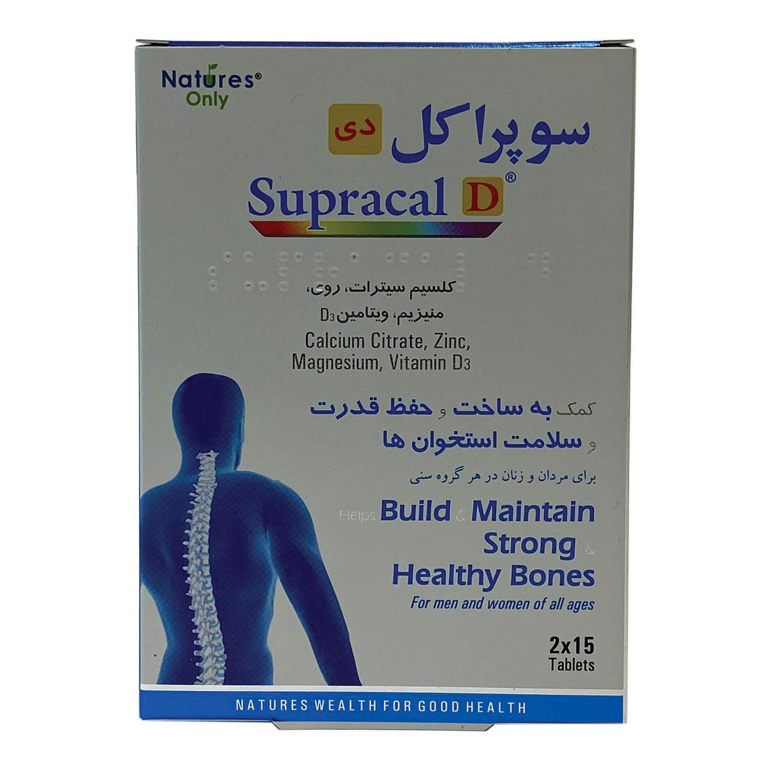 قرص سوپراکل دی نیچرز اونلی حاوی ویتامین دی، کلسیم، منیزیم و روی میباشد؛ ترکیبی فوقالعاده که سلامت و استحکام استخوانها را بهبود بخشیده، از بروز پوکی استخوان جلوگیری کرده و به درمان آن نیز کمک میکند. کلسیم موجود در این محصول به صورت سیترات است؛ به همین دلیل اختلالی در تولید گاز و اسید معده ایجاد نمینماید و جذب بسیار سریعی دارد. خرید سوپراکل دی نیچرز اونلی برای آقایان و خانمها در تمام گروههای سنی قابل استفاده بوده و برای دوران بارداری و شیردهی نیز مکمل مناسبی است.